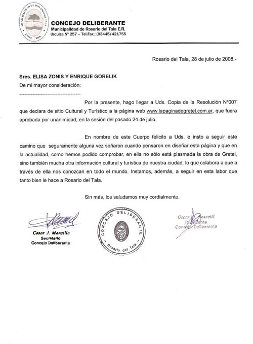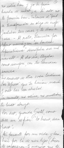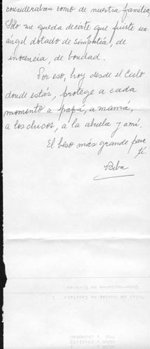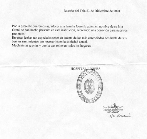 Por eso quiero agradecerle, dirigiéndome a ella en el lugar de estrellas y mágicos caminos de plastilina y de colores donde hoy camina, que me haya enseñado tantas cosas en sus cortos años. Que cada acción y cada recuerdo, o cada obra fuera pensada "para mostrar a papi y a mami", con la seguridad del reconocimiento que coronaría su esfuerzo. Por contarnos, con inocultable orgullo, los logros de Yani, de Flavio o de Lalo, a quienes su corazón atesoraba junto a la abuela Sara y a la abuela Rosa, a Quina, a Edicta, Juan, a Gustavo y a todos sus tíos y amigos entrañables...Y porque su alma de niña fue el libro abierto que nos enseñó, con un método nuevo, aplicable y perfecto, que no hay ciencia que pueda marcar la diferencia entre seres capaces de desentrañar las teorías más complejas y nuestra GRETEL y todas las que como ella, se plantaron en el mundo para decirnos que todo puede ser sencillo de entender , disfrutable y válido si lo miramos desde la humildad, la inocencia y la ilusión ilimitada del amor compartido.